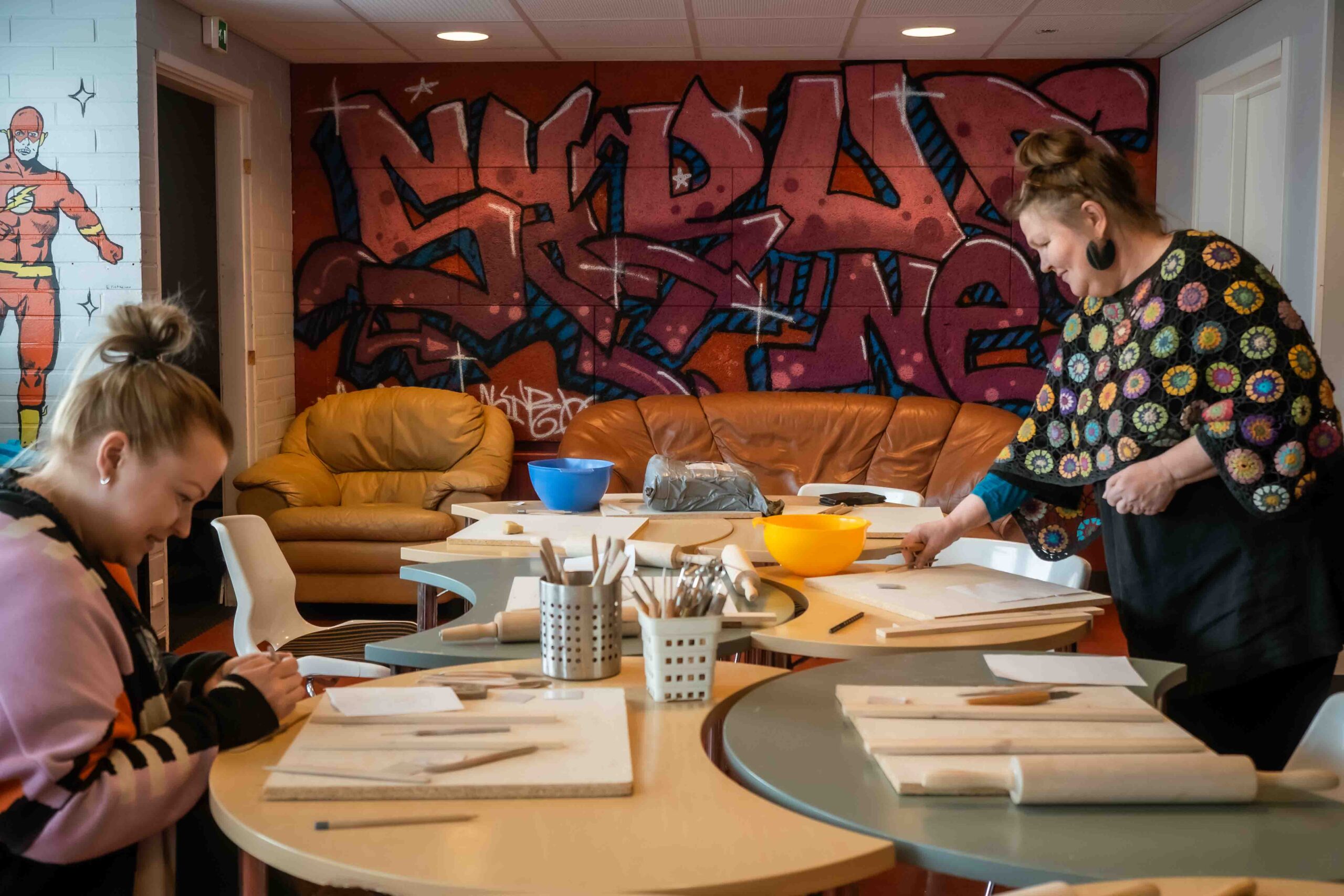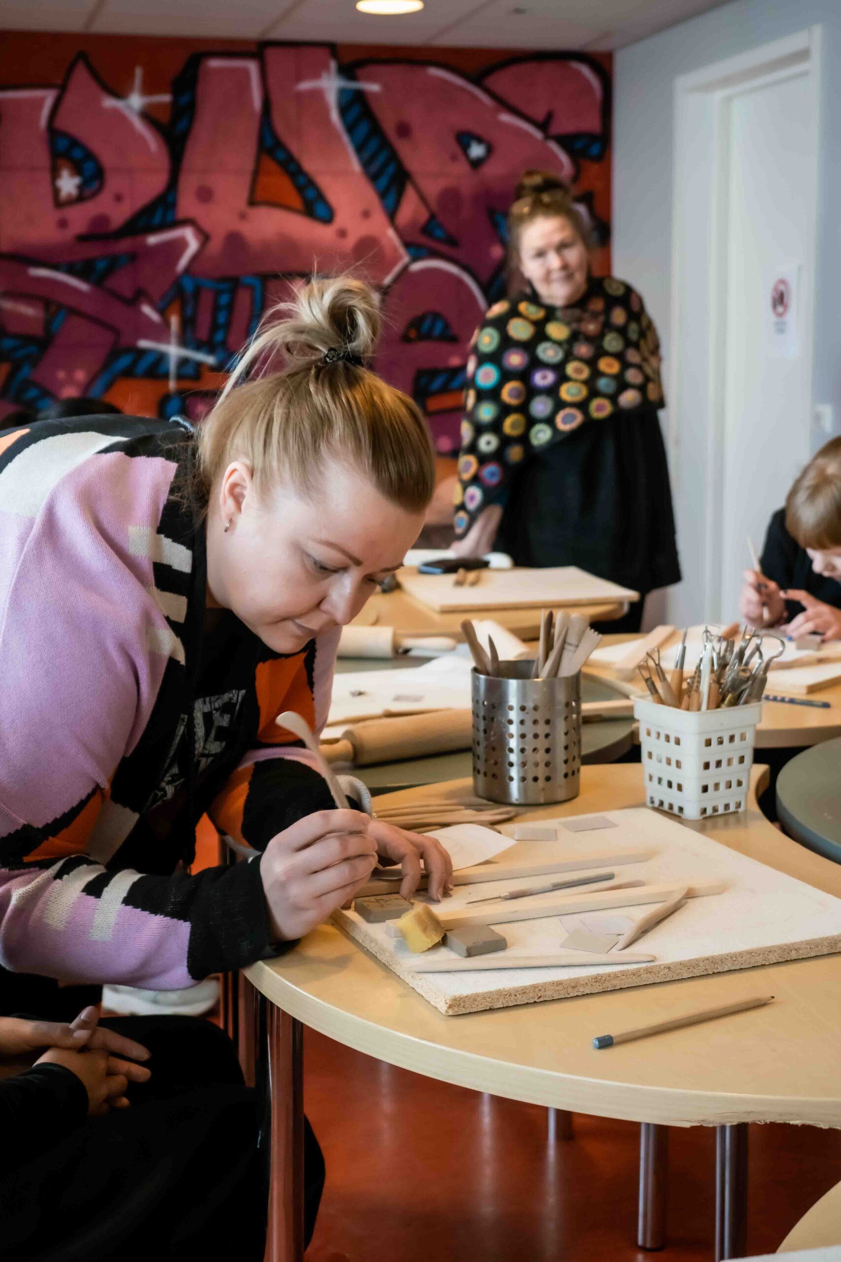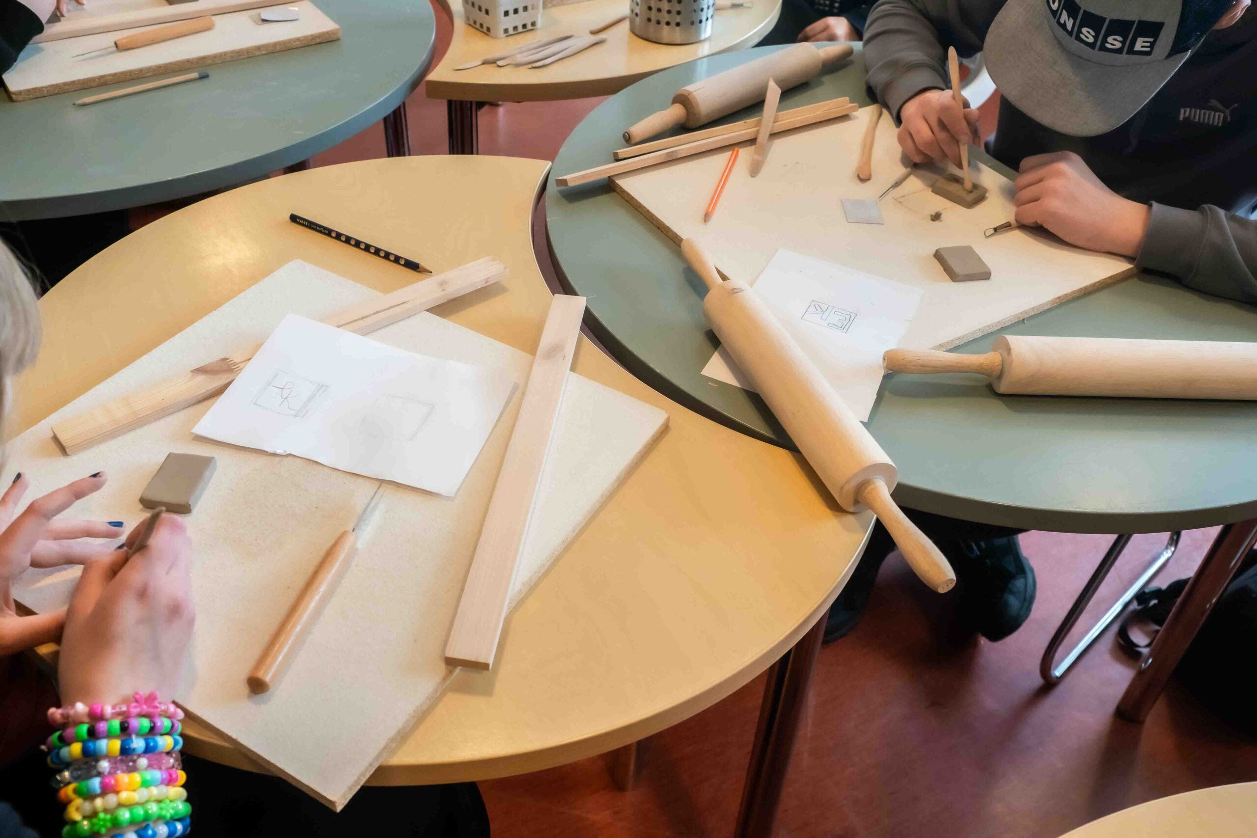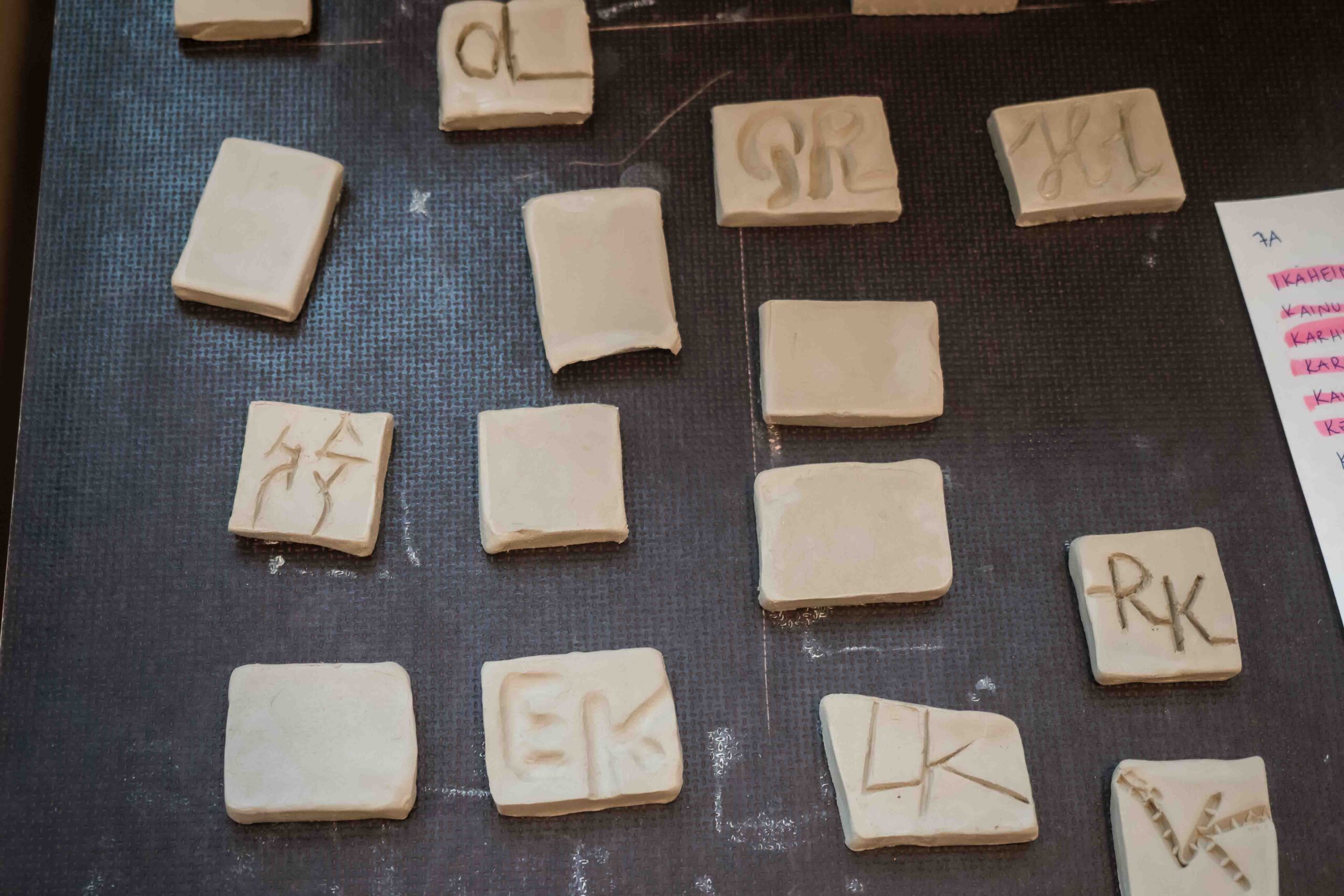Kukin oppilas suunnittelee penkin betoniseen tukipilariin oman tägin etu- ja sukunimen kirjaimista. Jokainen toteuttaa tägin itsetehdylle savi-mosaiikkipalalle. Mosaiikkipajat toteutetaan nuorisotalolla ns. musahuoneessa etupäässä välituntien aikana.